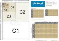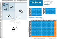 Clockwork provides three reference sheets that contain a representative image of the paper sizes relative to each other, a list of the actual sizes and then a table of enlargement and reduction ratios for getting from one paper size to another. Print one out and display it as a handy reference.